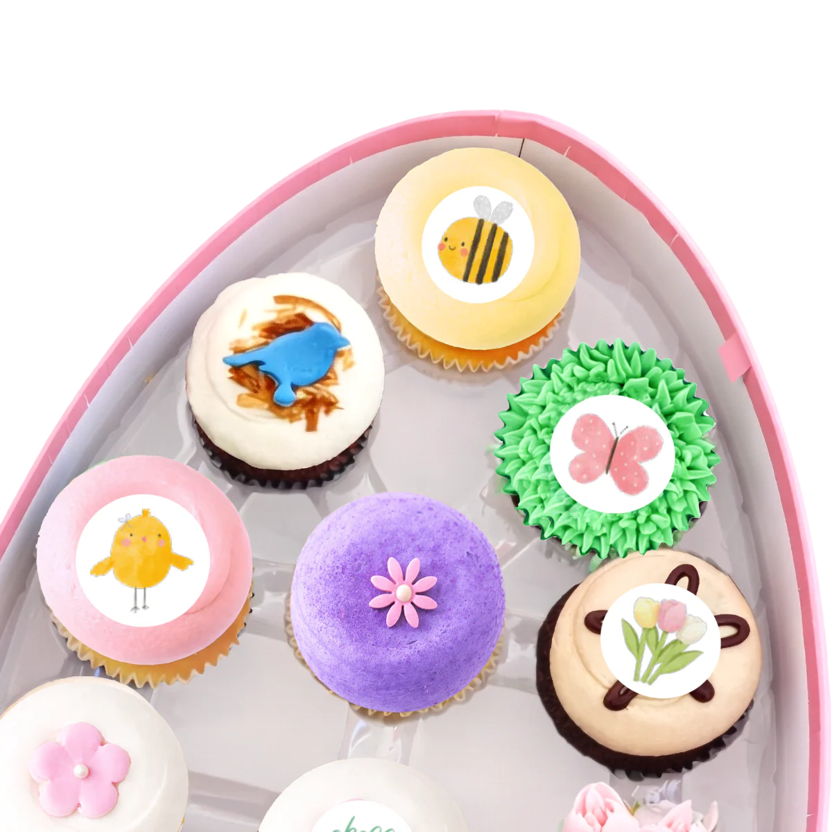 Georgetown Cupcake's Hello Spring Dozen packaged in a delightful pink egg-shaped gift box includes 12 different flavors: Salted Caramel, Chocolate Caramel Toasted Coconut, Vanilla Confetti with Baby Pink Vanilla Buttercream, Cherry Cheesecake, Chocolate with Green Grass Vanilla Buttercream, Pink Tulip, Red Velvet, Chocolate with Milk Chocolate Buttercream, Cherry Blossom, Peanut Butter Fudge, Vanilla & Sunshine Vanilla Buttercream, and Lavender Earl Grey Teacake, all topped with Spring-themed fondant decorations.